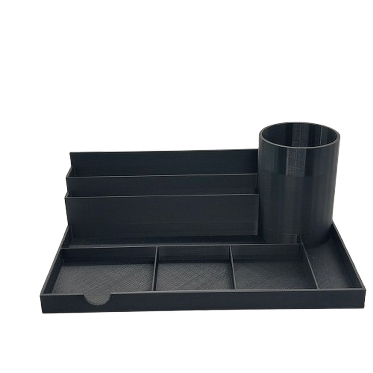 Ένας πρακτικός και μοντέρνος 3D-printed οργανωτής γραφείου κατασκευασμένος από ανθεκτικό PLA. Διαθέτει πολλαπλές θήκες για χαρτιά ή σημειώσεις, ξεχωριστά διαμερίσματα για μικροαντικείμενα και μια κυλινδρική θήκη ιδανική για στυλό και μολύβια. Ο εργονομικός σχεδιασμός του βοηθά στην άψογη οργάνωση του χώρου εργασίας, ενώ η minimal εμφάνιση ταιριάζει εύκολα σε κάθε γραφείο. Ιδανική λύση για όσους θέλουν τάξη, πρακτικότητα και μοντέρνο στυλ.